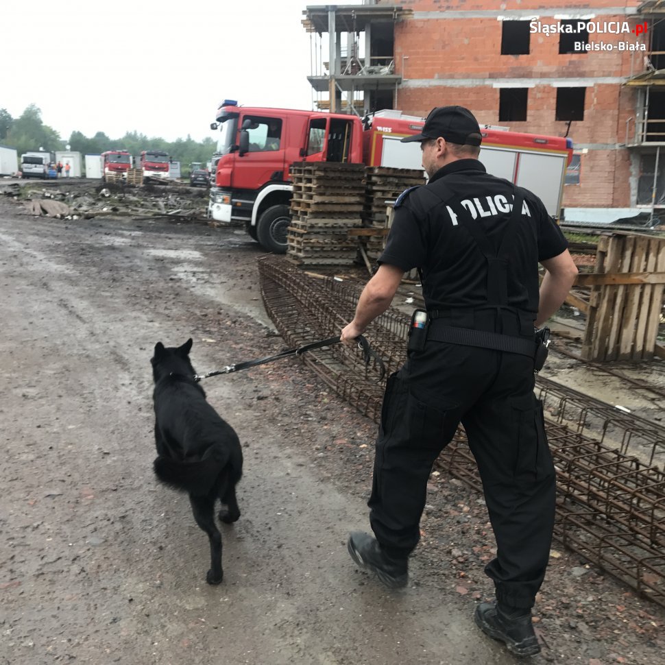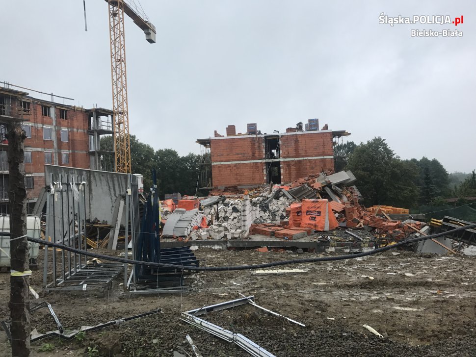 Budynek uległ całkowitemu zniszczeniu. Na miejscu pracują policjanci z bielskiej komendy, policyjni technicy kryminalistyki, śledczy z Laboratorium Kryminalistycznego Komendy Wojewódzkiej Policji w Katowicach, policyjni antyterroryści oraz prokuratorzy. Grupy dochodzeniowo – śledcze zabezpieczają ślady i dowody. Przeprowadzane są szczegółowe oględziny miejsca, celem wszechstronnego wyjaśnienia okoliczności, w jakich doszło do tego zdarzenia. Policyjni pirotechnicy oraz przewodnicy wraz z psami szkolonymi do wykrywania materiałów wybuchowych, krok po kroku przeszukują gruzowisko oraz cały teren budowy. Miejsce zdarzenia przeszukują i zabezpieczają także strażacy.