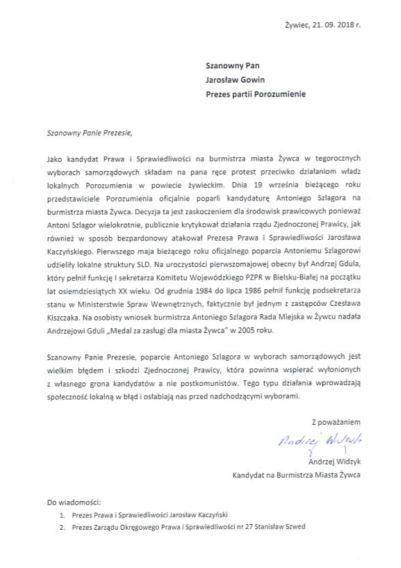 "Szanowny Panie Prezesie, poparcie Antoniego Szlagora w wyborach samorządowych jest wielkim błędem i szkodzi Zjednoczonej Pawicy, która powinna wspierać wyłonionych z własnego grona kandydatów a nie postkomunistów. Tego typu działania wprowadzają społeczność lokalną w błąd i osłabiają nas przed nadchodzącymi wyborami." - czytamy w piśmie Andrzeja Widzyka, skierowanym do Jarosława Gowina i przekazanym również do wiadomości prezesa Prawa i Sprawiedliwości Jarosława Kaczyńskiego i prezesa Zarządu Okręgowego 27 PiS Stanisława Szweda. Całość pisma znajdziecie w galerii, poniżej