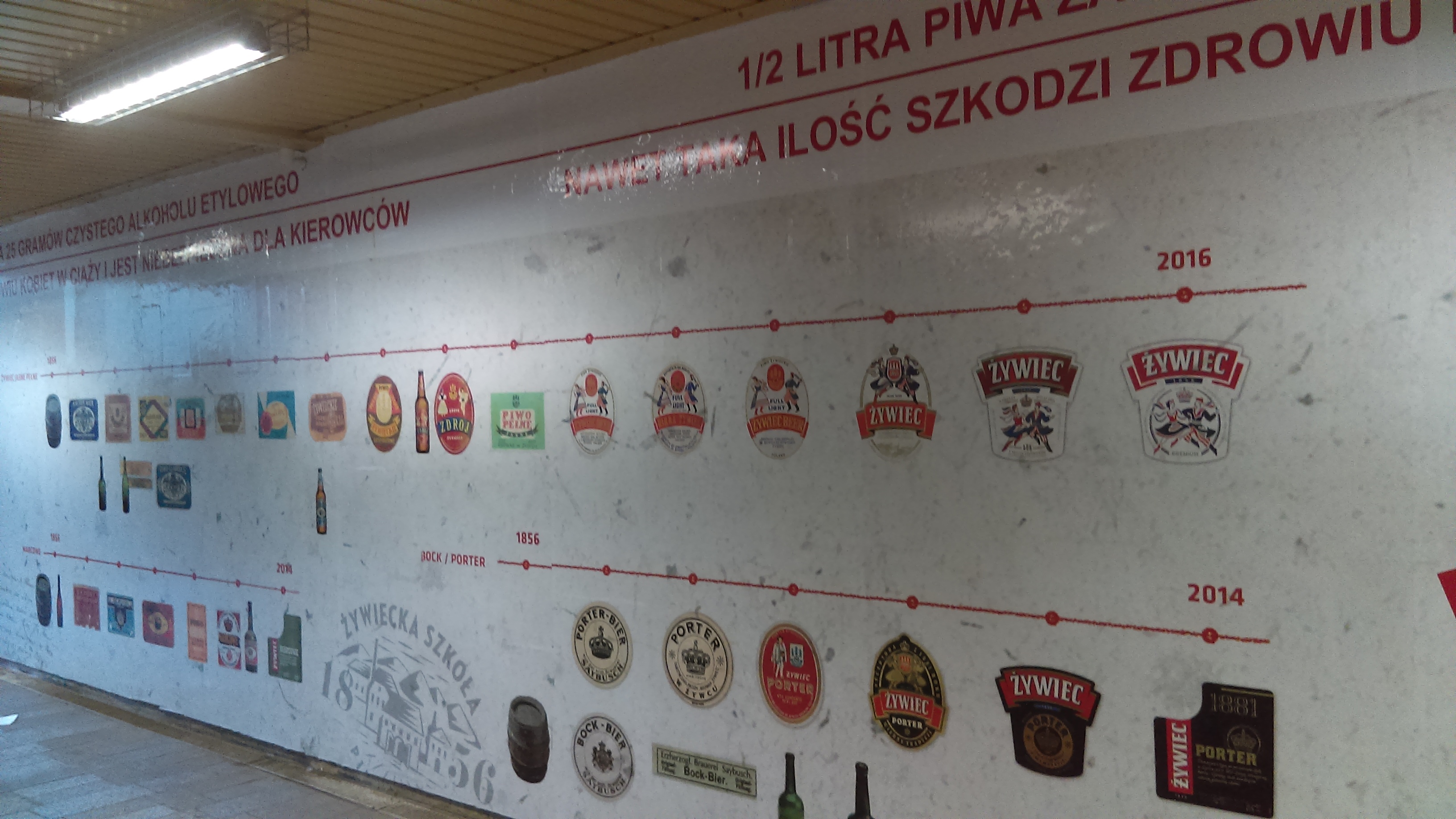 Przywołane przejście podziemne zrewitalizowano dzięki pomocy Grupy Żywiec. Dlatego zapewne ściany tunelu pokryte są jej reklamami. Chwała fundatorowi za taki fakt. Przedstawiona na prawej ścianie linia rozwoju zakładów może budzić ciekawe skojarzenie z przejściami podziemnymi przy dworcach dużych miast. Tam zobaczymy często na ich sieć komunikacyjną różnych środków lokomocji miejskiej. W Żywcu to reklama piwa i jedyny kierunek – browar. Wielu osobom z głębi kraju słowo „Żywiec” kojarzy się przecież tylko z piwem.